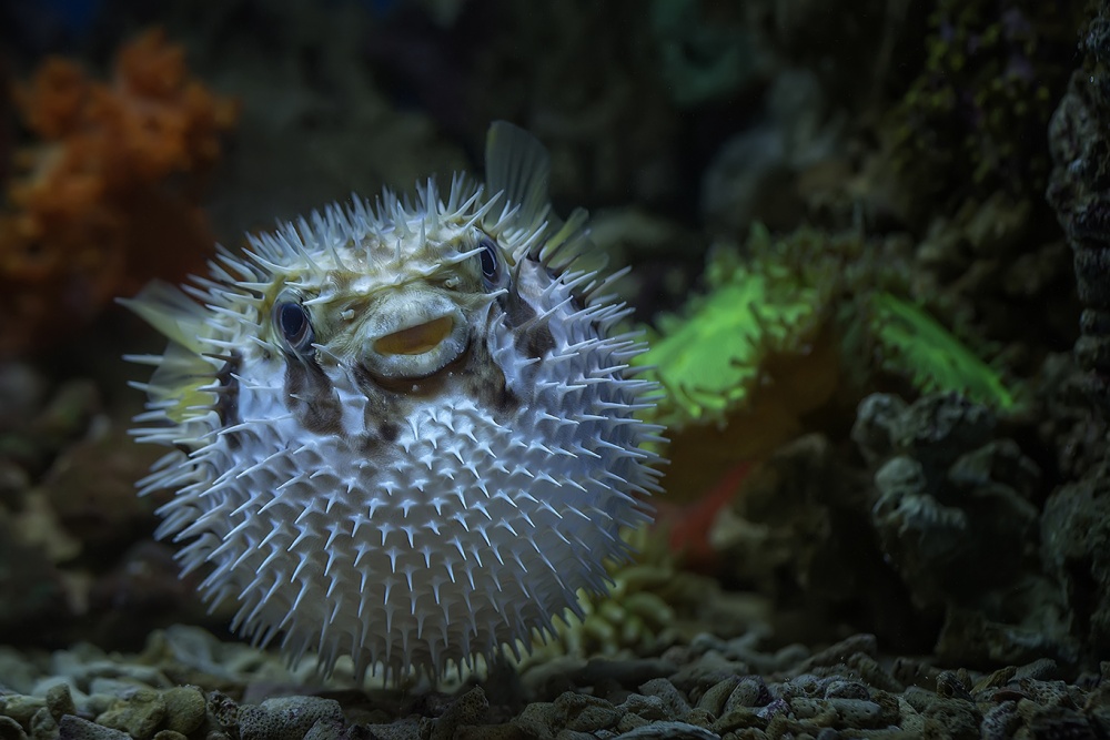 The pufferfish is nicely photographed. The hedgehog-like nature of the beast comes all into its own. Funny actually that this aggressive looking little guy has such a soft blue appearance. It obviously makes him stand out well against the dark background. Incidentally, perhaps I would have desaturated  the light bright green leaf in the background a bit. Otherwise nothing but praise for this lovely photo.