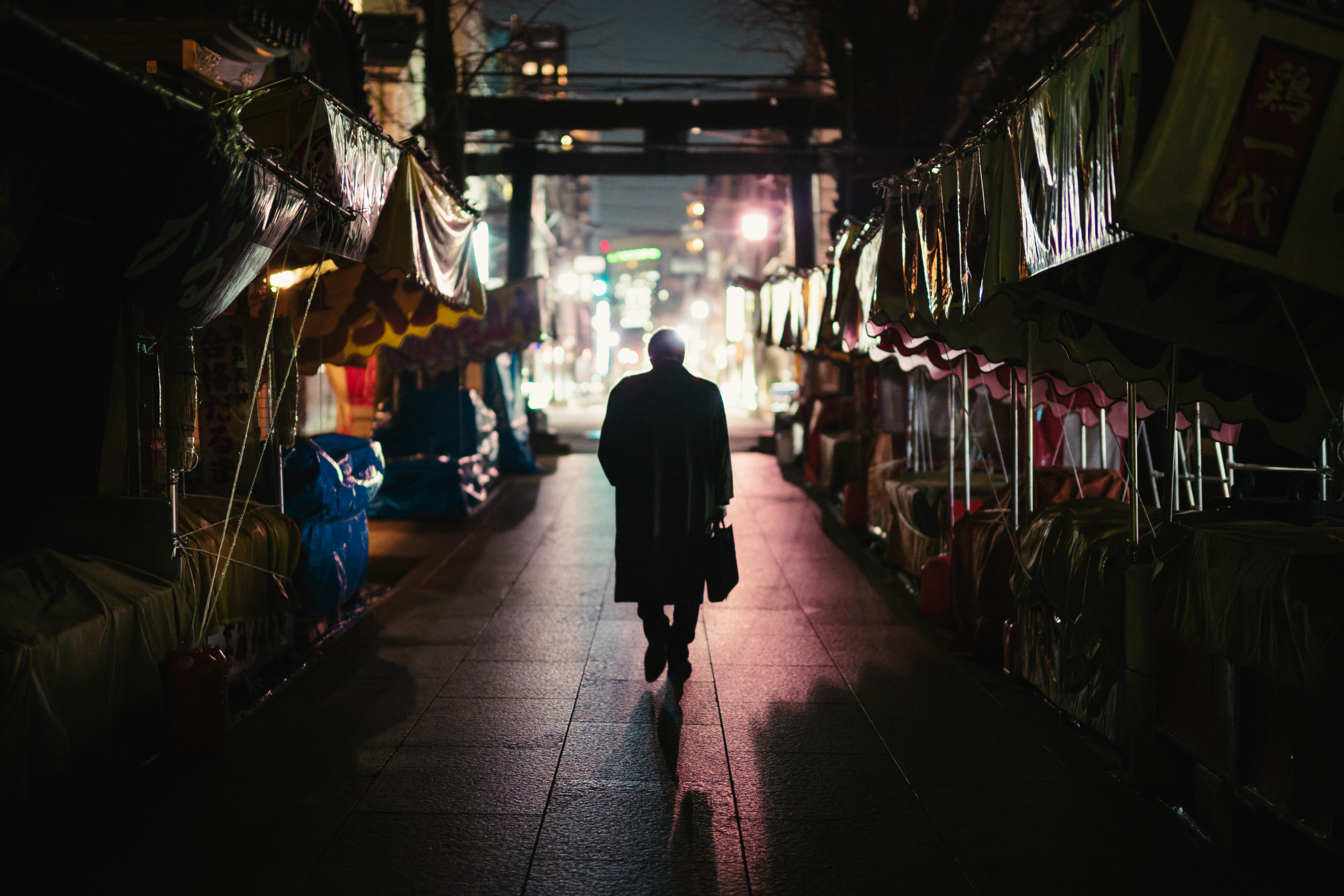This picture by Yuzo Fujii of a dark alley, traveled by a shadowy figure carrying a suitcase and silhouetted by the glare of street lights beyond, captures the feeling of the night very well.