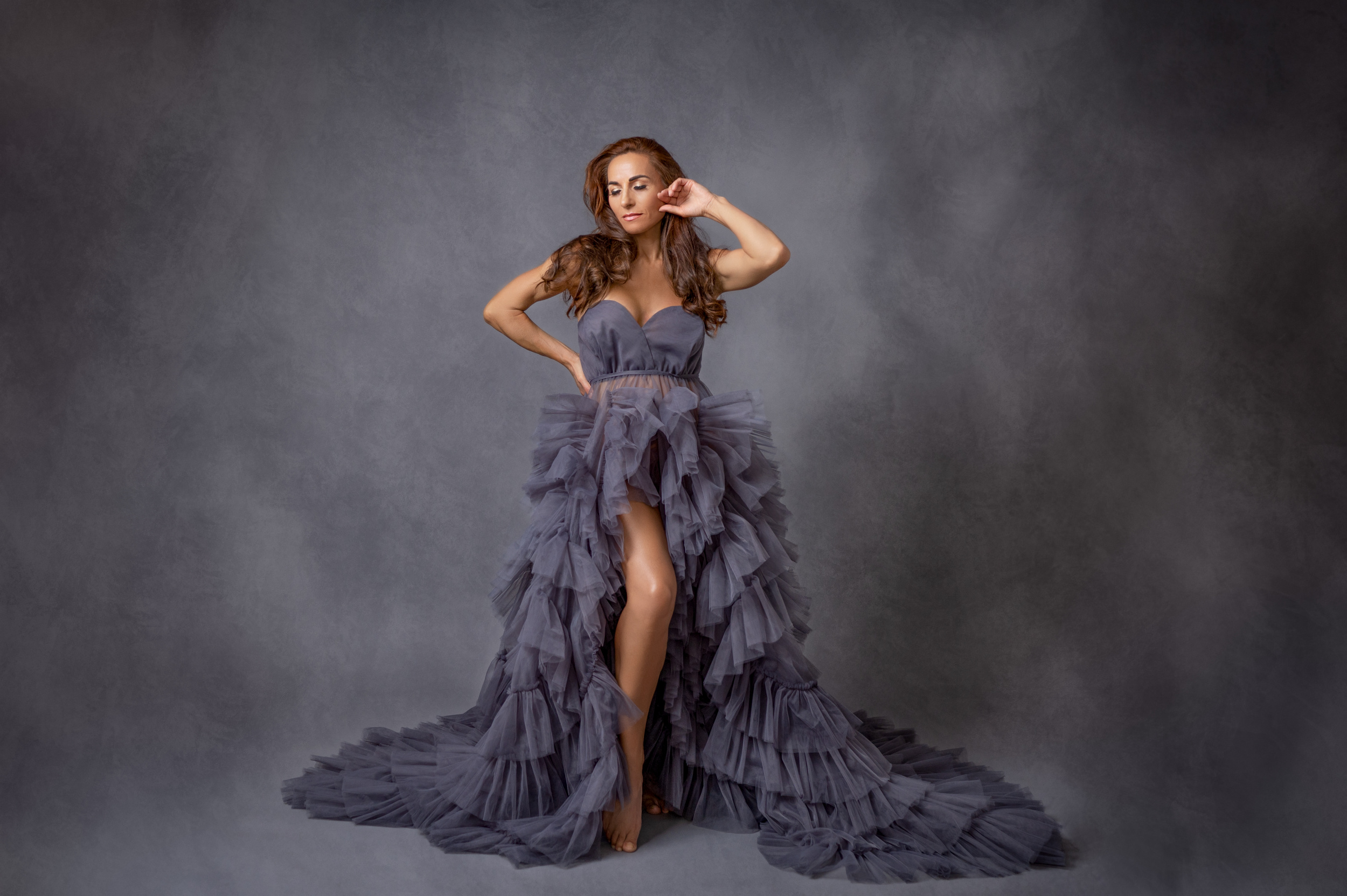 The subject’s arms are also important in maintaining the overall S-curve or hourglass shape.  For example, if the arms are facing downwards, it is important that the elbows are slightly bent so that there is a gap between them and the waist, else the shaping effect is lost. Symmetrical shaping of the arms (as in both hands on hips or above the head) is often effective but, taking the concept of contrapposto  a little further, posing the arms asymmetrically (one hand on the hip, the other stroking the hair) can give a wonderful sense of visual balance, movement, sensuality or drama, as in Michaelangelo’s David.