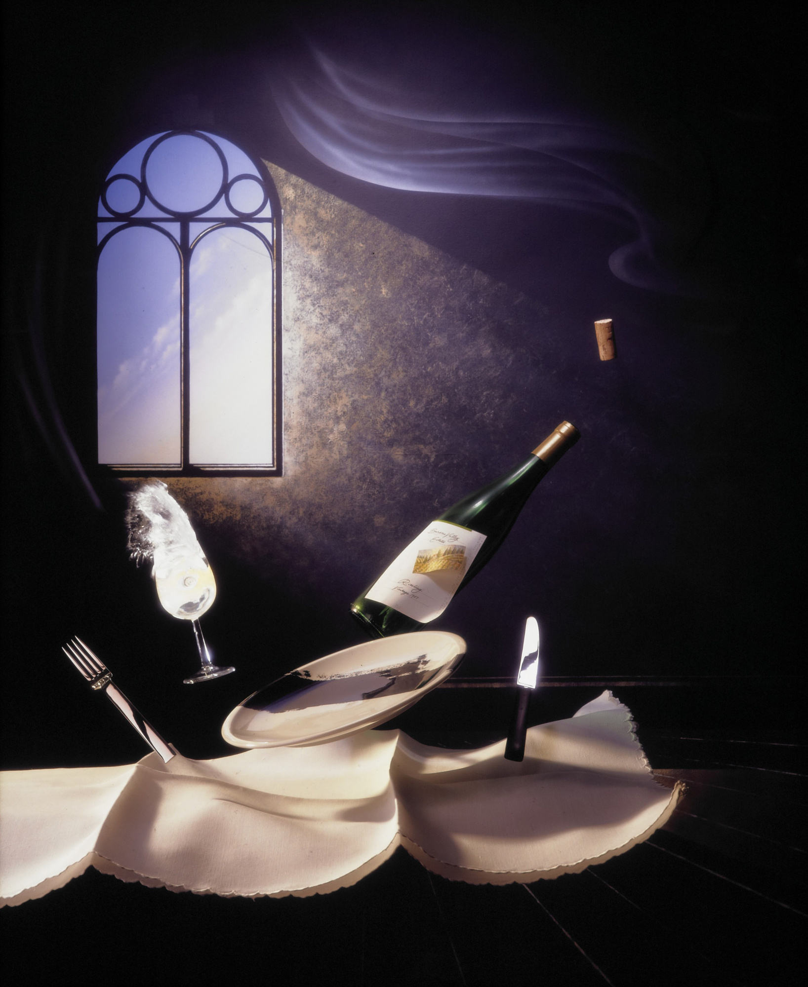 Of course not all images are the same. Each project has its own requirements. “Dinner with Dali” didn’t require any tech at all. The background was painted, the dinner set was rigged on armatures and the lightly coloured water was blown out of the glass from a tube welded into the back of the glass and fed through the background painting. I simply blew through the tube to force the water out of the glass and fired the shutter by hand judging the right moment by eye.