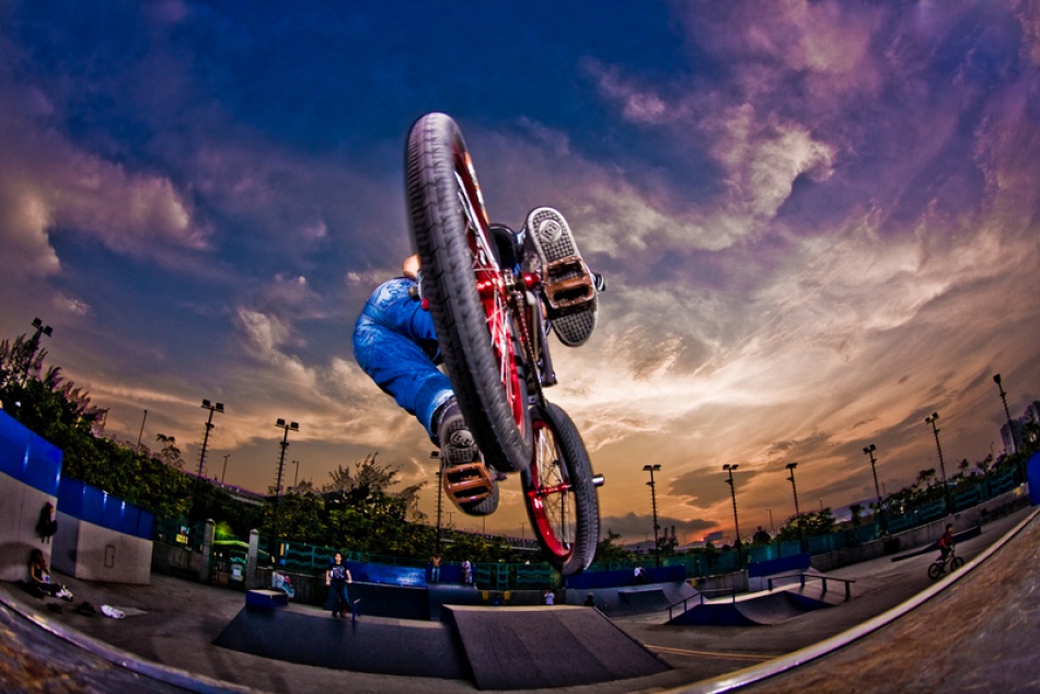 BMX freestyle riders perform as many stunts as possible in 60 seconds - jumps, flips, spins, and other tricks.